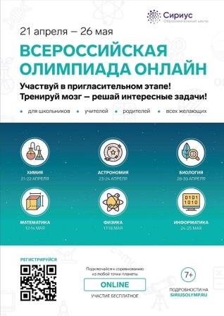 Для учеников 4-10 классов с 20 апреля по 27 мая 2020 года  Образовательный центр «Сириус» проведет пригласительный этап Всероссийской олимпиады школьников. Соревнование будут проведено в онлайн — формате.Для участия  в олимпиаде, необходимо пройти регистрацию на  сайте центра «Сириус». и указать предметы (один или несколько).